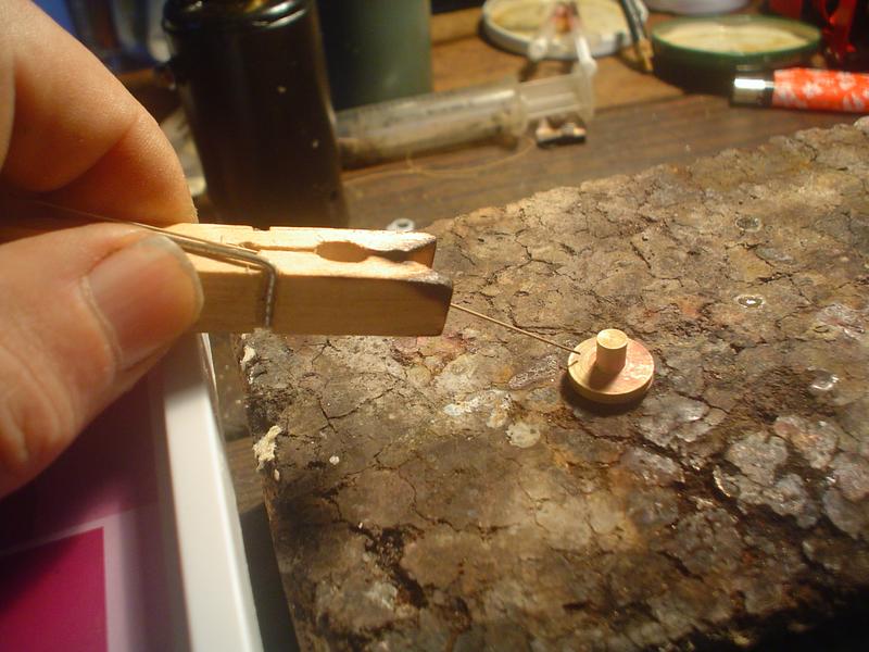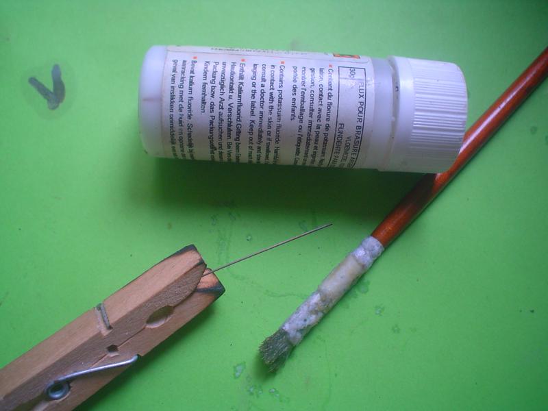 | |  | | pincer le fil de brasure dans une pince (même si on n'a pas la tremblote comme moi !), badigeonner au pinceau les pièces à assembler avec le décapant |