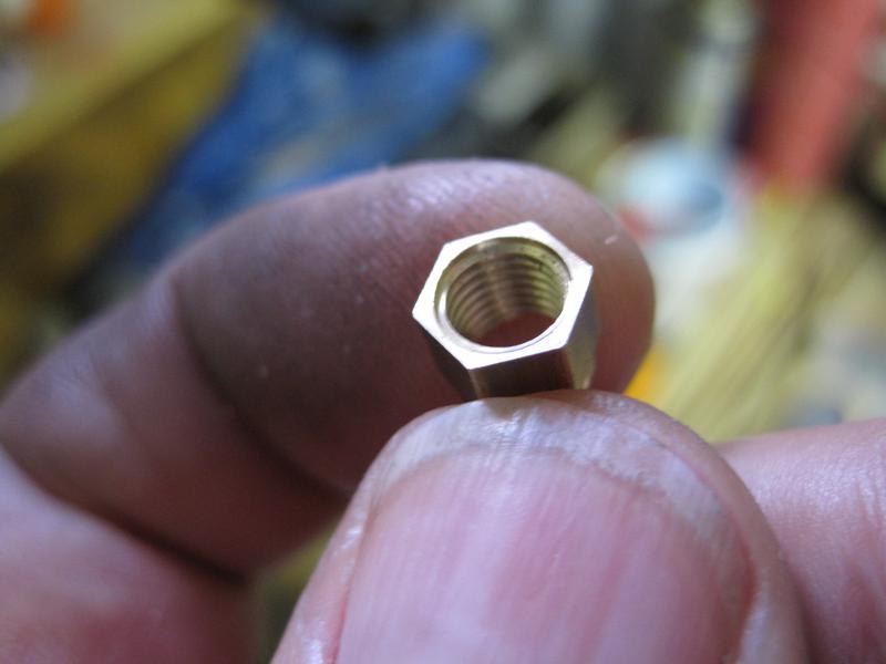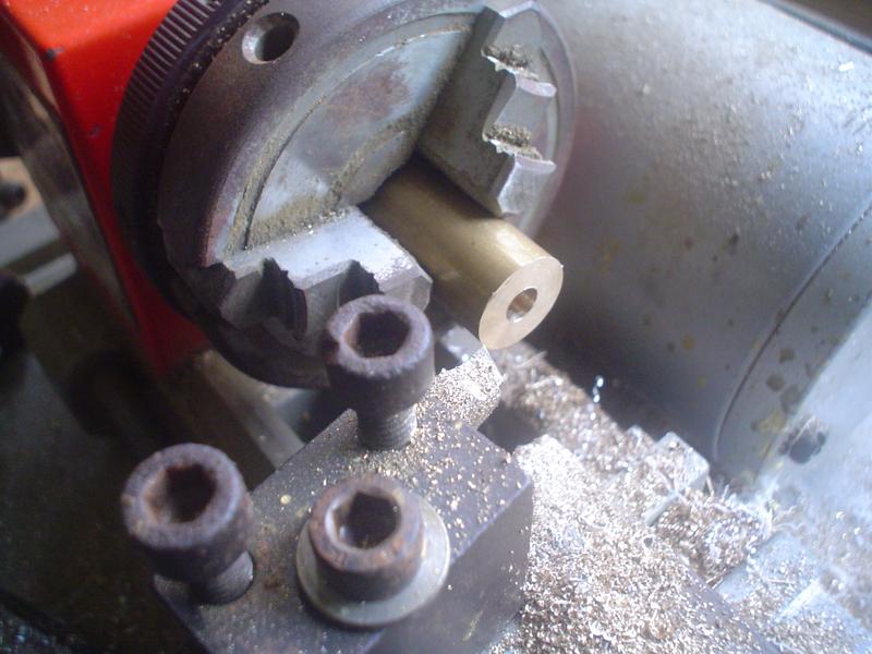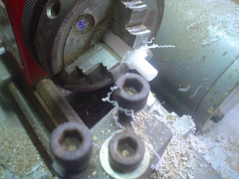 L'enfiler sur un rond d'alu que l'on place dans le mandrin, réduire le diamètre pour arriver au diamètre intérieur de l'écrou, débiter des rondelles de 1,5 d'épaisseur au cutter.