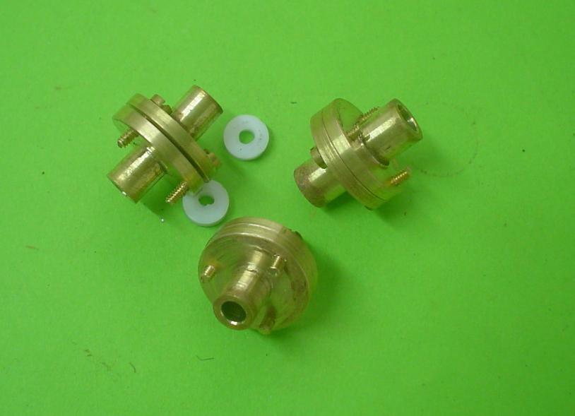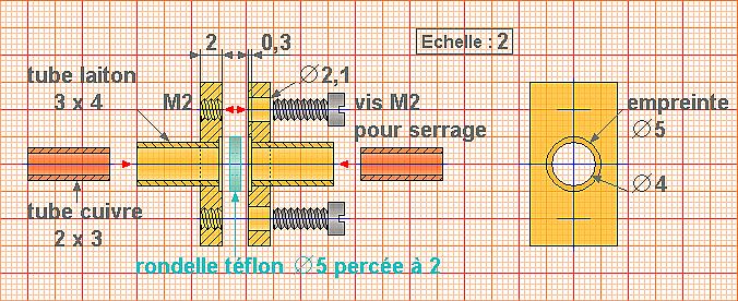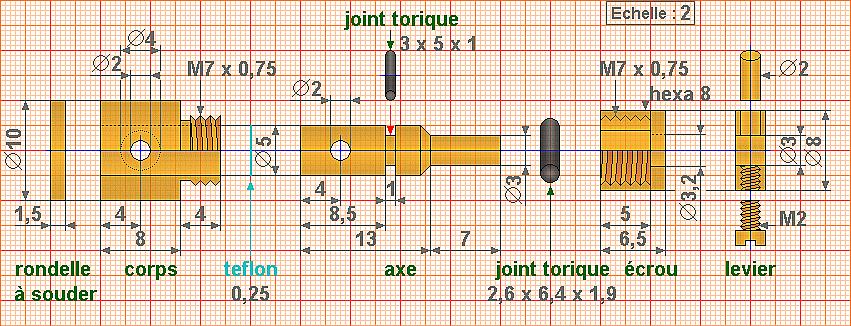 | l'ensemble des pièces en 1, une virole un peu plus haute pour favoriser la mise en place, sinon on se cogne au tube central; même chose pour la rondelle de téflon qui fait 1 d'épaisseur ... en 2, un peu plus large que le trou de réception, cela facilite le brasage ; le tube en laiton de 3 x 2 sera ainsi enduit de brasure.