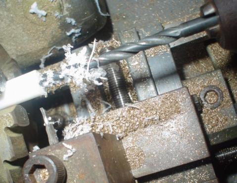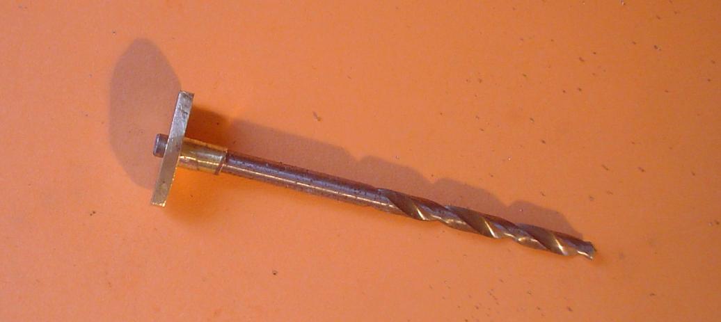 Pour un vissage en M 2, on perce à 1.6. Il faudra aussi percer à 4 pour le tube. En plaçant 2 forets de 1.6, l'un dans le trou central et l'autre à son emplacement normal, on obtient une pente qui va servir de référence pour le fraisage. |