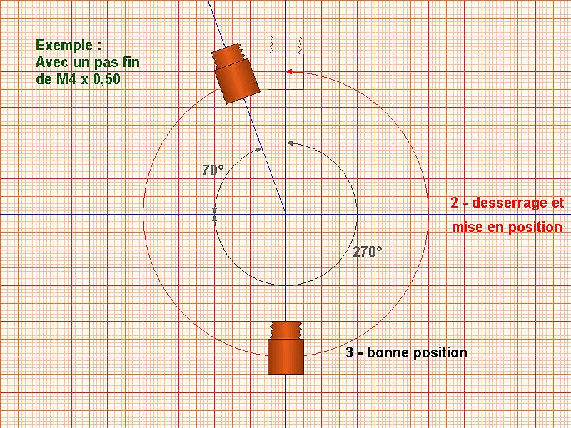 3ème cas avec un pas fin français , plus grave : pour redresser l'accessoire, il faut le desserrer de 70° + 270° = 340° ce que donne un déplacement de 340 / 360 = 0.945 et l'épaisseur de la rondelle sera de 0.50 x 0.945 = 0.472 ... et cette fois on peut éliminer les 0.5 prévus au départ. |