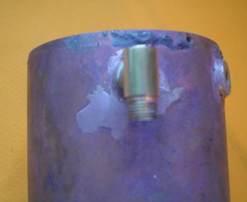 - étanchéité obtenue simplement en soudant le tube d'évacuation (cuivre recuit à reprendre au tour pour que la lèvre soit bien d'équerre) à ras du passage intérieur : le cône de laiton va l'évaser légèrement (quelques tours en forçant avant l'utilisation) et ... plus de fuites !