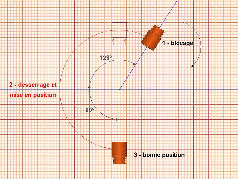 L'accessoire est bloqué et on apprécie avec la fausse équerre l'angle qu'il devrait parcourir pour être en position. La proportion angulaire par rapport 360° sera à appliquer au déplacement que fait l'accessoire en 1 tour. |