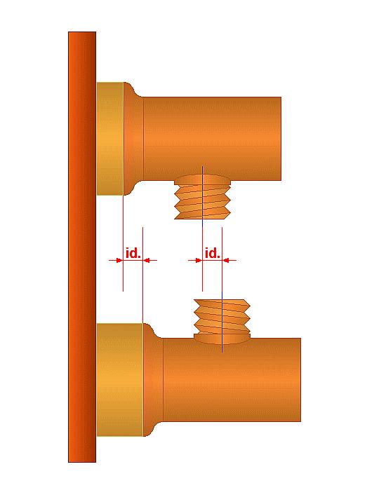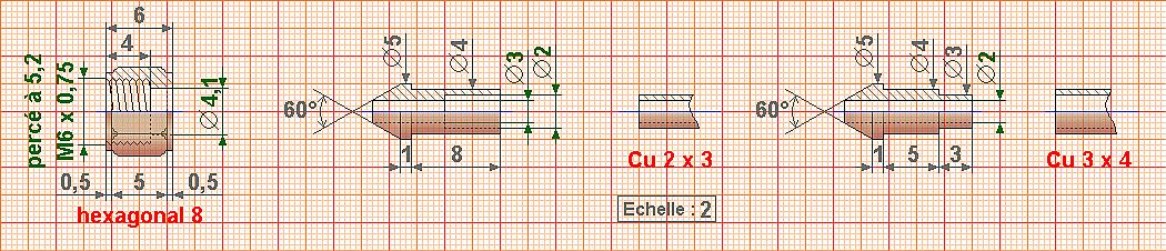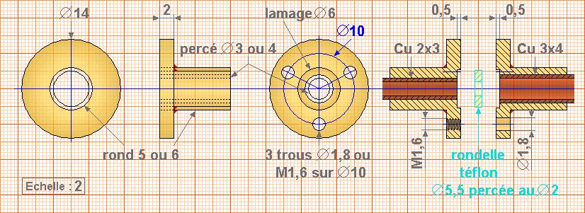 Ici le diamètre est de 14 pour la rondelle ce qui permet de recevoir facilement le rond de 5 ou de 6 qui sera percé à 3 ou à 4 selon le tube de cuivre à adapter. A noter, que grâce à la fabrication en série, on peut très bien concevoir de raccorder un tube de 2 x 3 et un tube de 3 x 4 (dernier croquis) |