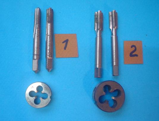 1 - tarauds et filières au pas fin M 6 x 0.75 , perçage à 5.2 2 - tarauds et filières au pas fin M 8 x 0.75 , perçage à 7.2 Le taraud finisseur est passé à la meule pour que les filets aillent bien dans le fond. |