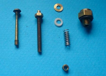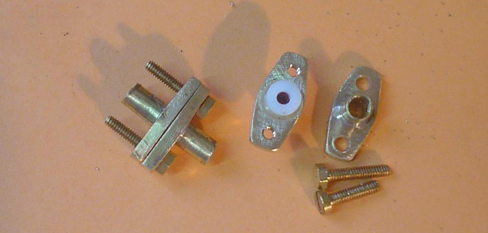| Brides prêtes à l'usage après avoir ajusté la longueur des vis. Quant aux rondelles de téflon, on les obtient facilement et à la bonne taille en se fabricant le petit ustensile décrit ci-contre:: |