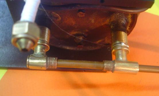 - perçage complet à 2.5 puis taraudage à M 3 pour visser une tige (soudée ensuite à l'étain) qui maintiendra le graisseur en place le problème étant que démontages et remontages finissent par "fatiguer" la liaison sur le moteur.