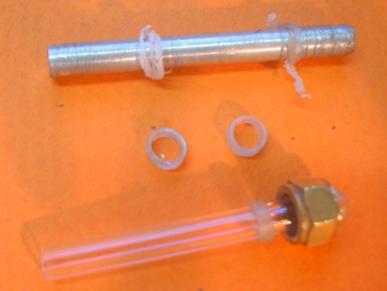 Le truc : enfiler le tuyau sur un rond d'alu du diamètre du tube de pyrex ... et le réduire au tour pour que ça entre facilement (photo ci-contre). Petit coup de papier de verre, découpe au cutter ...