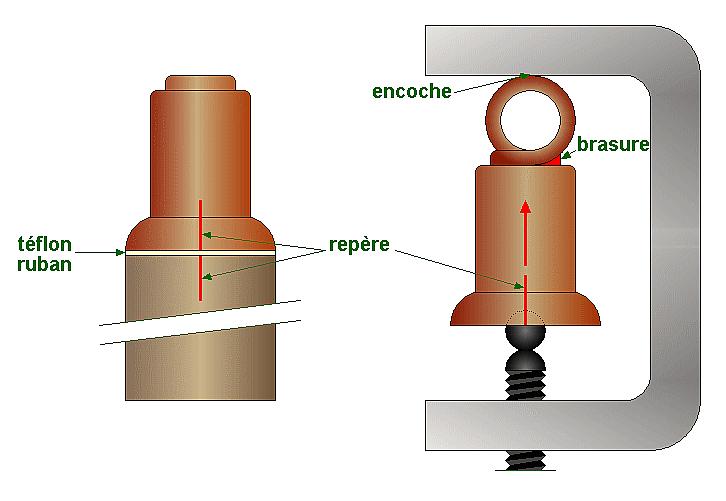 | A gauche, le positionnement préalable : mettre le téflon et serrer l'élément horizontal du niveau sur la virole. Traçage sur la virole pour bien repérer son emplacement avant de procéder à la brasure. Ce procédé peut éviter bien des tracas ensuite pour l'alignement ...