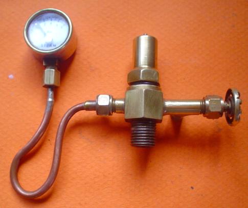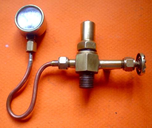 La construction est devenue classique. Toutes les pièces étant brasées, il n'a pas été possible d'ajouter cette fois le petit manchon de cuivre qui se déforme sous la pression du pointeau. Mais, après plusieurs serrages, on obtient un bon résultat. Petit montage testé avec le compresseur, l'arrivée vapeur étant plongée dans l'eau - pas de bulles quand la poignée est en position fermée ! |