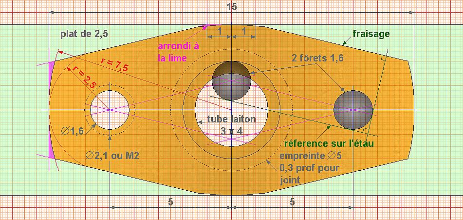 |  | Avant de commencer, se fixer les contraintes : brides pour tubulure de 2 x 3 ou de 3 x 4 ; vissage en M 1.6 ou M 2 ; des vis à tête fendue ou six pans (la distance entre les axes ne sera pas la même à cause du tube central et, pour les secondes, il faut pouvoir glisser la clé). Pour le cas présent : tubulure prévue en 2 x 3 qui viendra se souder dans un tube 3 x 4 ; visage en M 2, vis spéciale à tête six pans (largeur de la tête réduite).