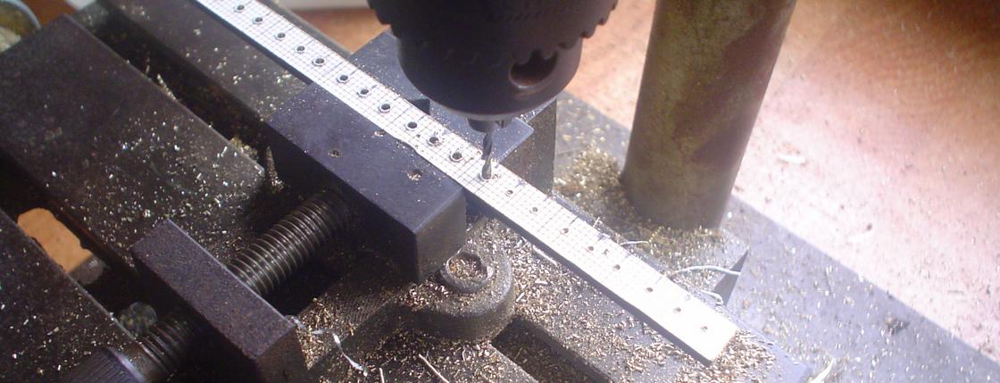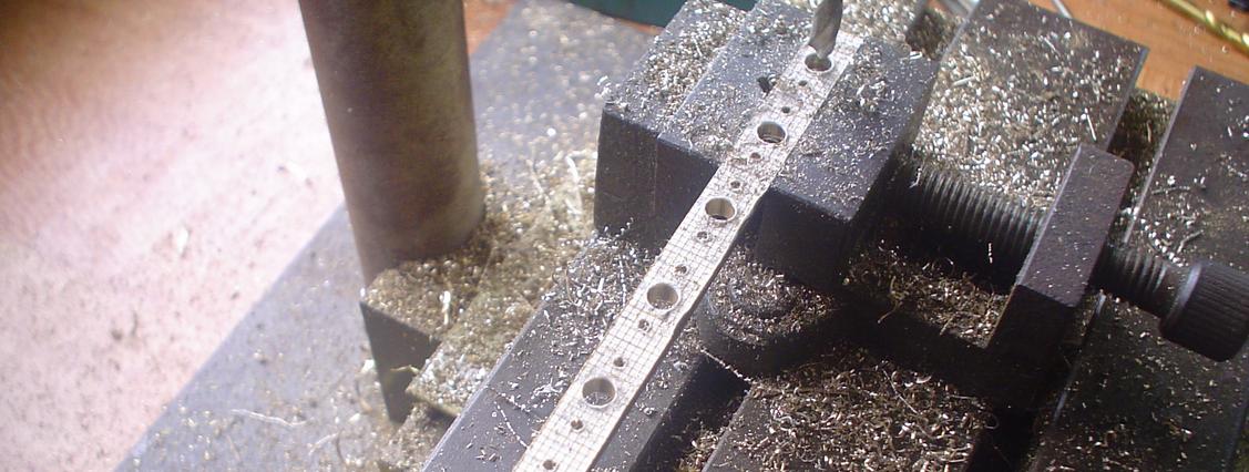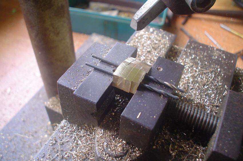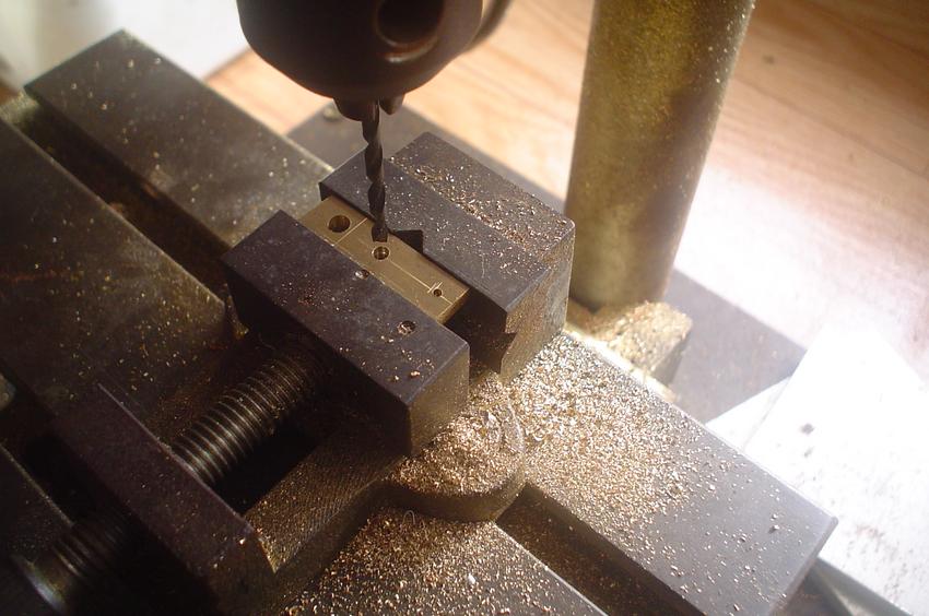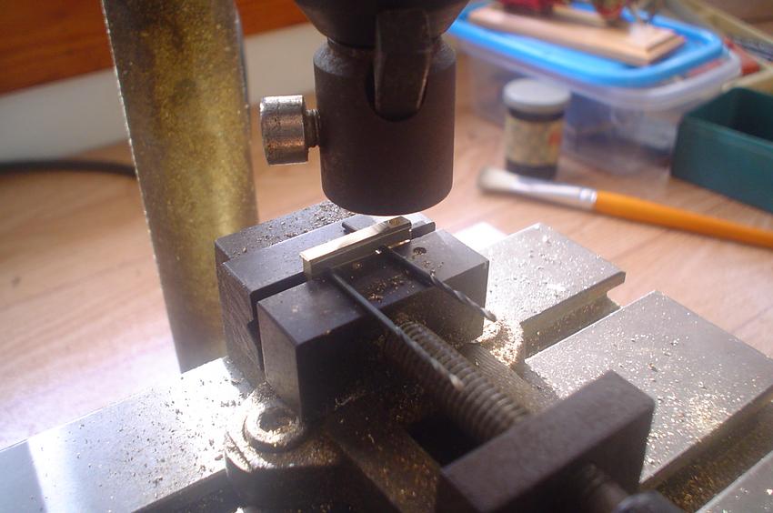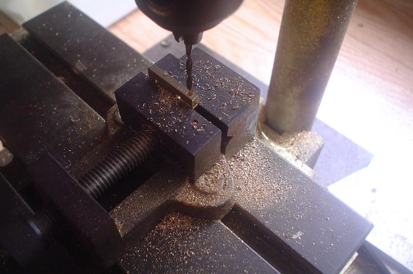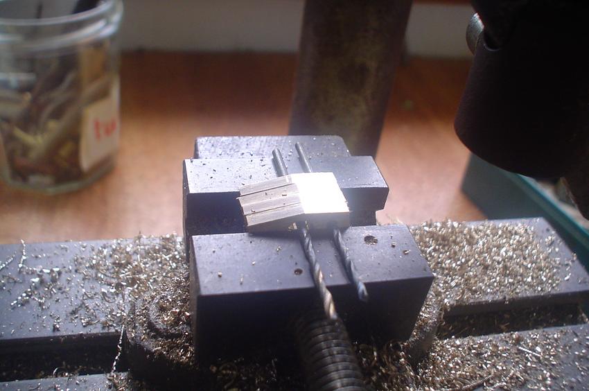 | | disposition dans l'étau : 2 forets de 1.5 , plutôt que 1.6 difficiles à enfiler, et fraisage |