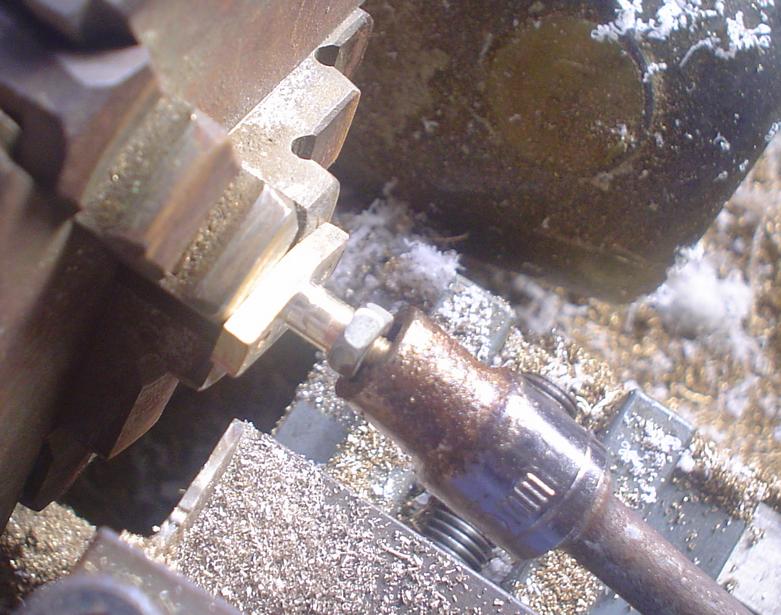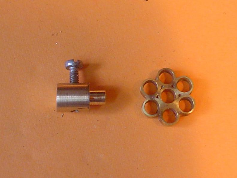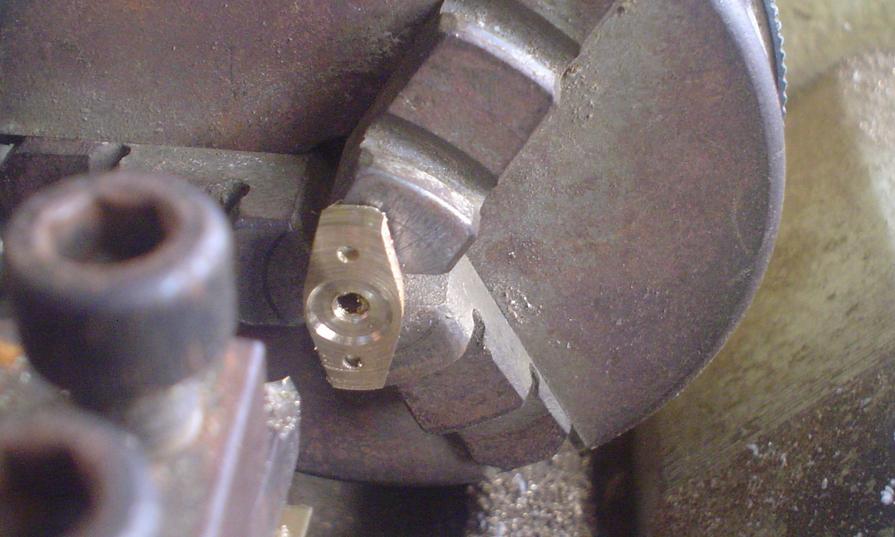 C'était l'occasion d'essayer autre chose que le volant traditionnel. Partir d'un plat de laiton de 2.5 d'épaisseur, procéder au perçage des trous de 1.2 pour taraudage futur à M1.6, et de 2 (le "gros trou" qu'on aperçoit n'a rien à voir car il s'agit d'une chute). A l'aide de forets de 1 qui assurent la bonne position, fraiser pour obtenir la pente. Puis réaliser les plats en s'aidant du traçage de l'axe. Percer à 1.2 sur le chant, scier la fente et reprendre un des trous au diamètre 1.8. Il ne restera plus qu'à tarauder le trou pour le serrage et celui pour la poignée. On peut utiliser une jolie vis et de beaux écrous ...