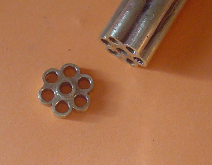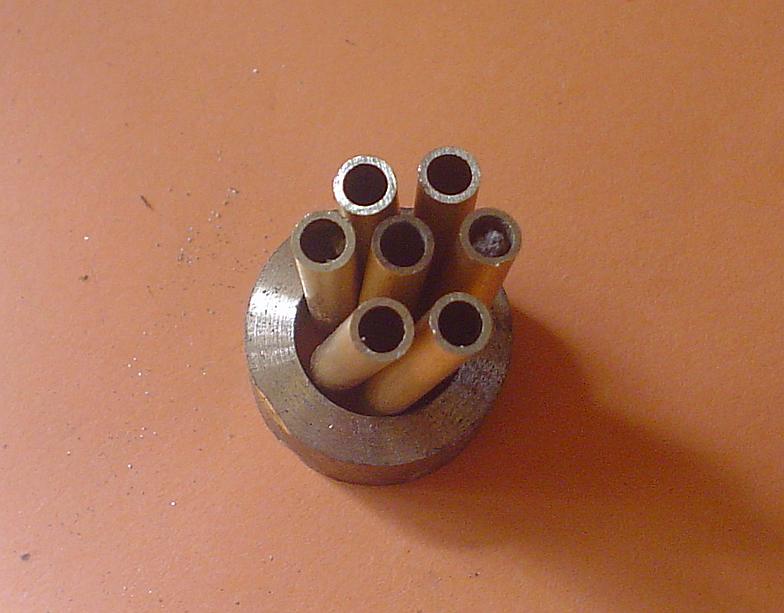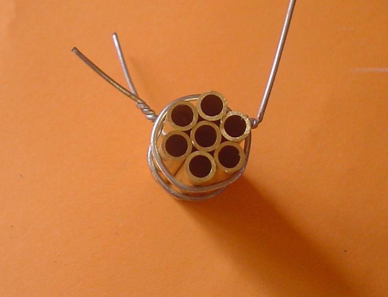 Le principe est simple : on soude 7 tubes dont l'un sert d'âme (brasure abondante pour une fois). Je n'ai pas essayé l'étain ... à réserver, si ça fonctionne, pour des volants que l'on va peindre. |