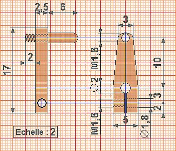 Pour le serrage, vis de M1.6 dont la tête passera facilement. Une bride percée à 1.8 et l'autre à 1.2 pour un taraudage à M1.6. |