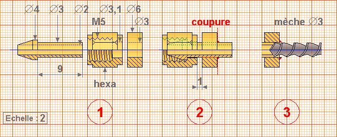 | | préparer un rond de laiton fileté à une extrémité (ici M3), un écrou et une douille ... |