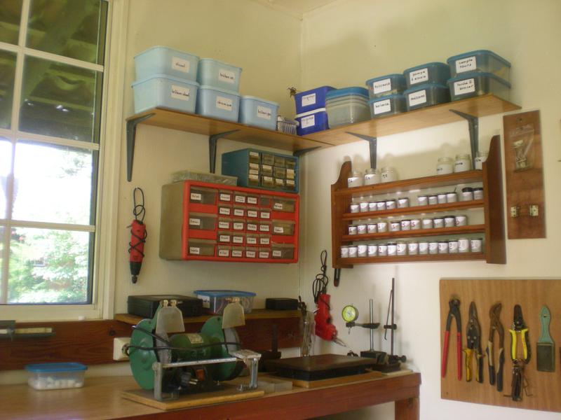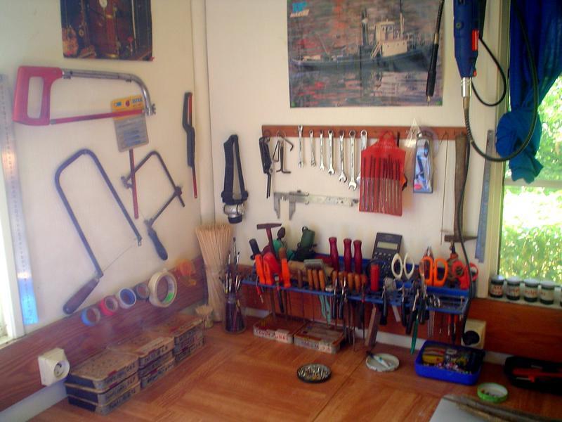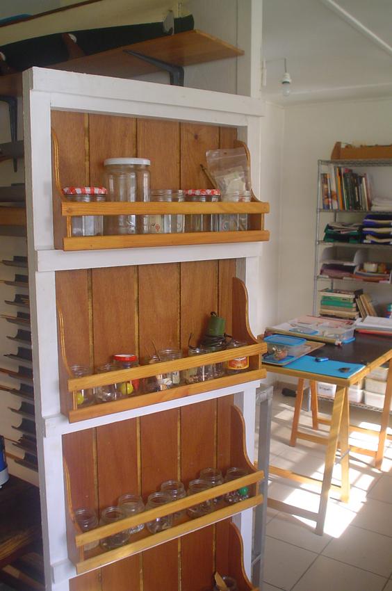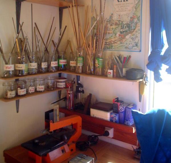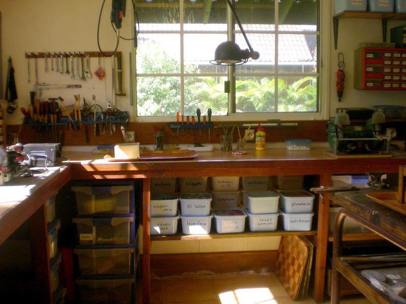 A droite, scie à chantourner et, toujours des bocaux, réserve de matériaux divers ...(vieille photo, j'ai oublié d'en refaire une !) |