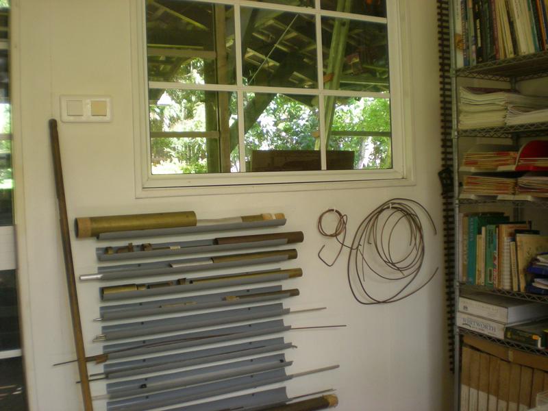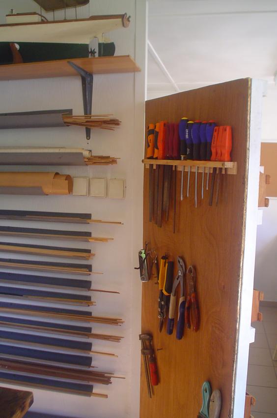 Sur le côté, le rangement des baguettes en bois dans des demi-tubes en PVC. Il existe le même type de rangement dans la première pièce pour tout ce qui est "métallique". |