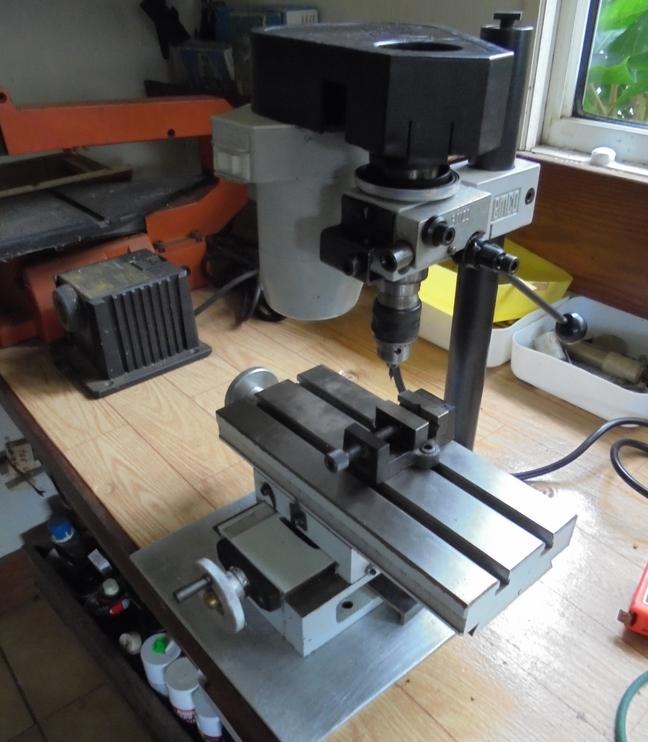 La perceuse à colonne, pas bien gros modèle ! Avec, cette fois, un spot éclairant la zone de perçage.