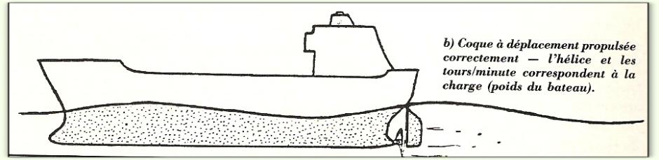 "Une grande hélice tournant lentement est plus efficace qu'une petite hélice tournant à haute vitesse : la raison d'être d'une hélice est de donner une accélération à l'eau qui y pénètre; il est possible d'accélérer un petit volume d'eau à grande vitesse ou un grand volume d'eau à petite vitesse et d'avoir la même poussée. Cependant, le 2ème système est le meilleur."" ( Simon HIGGINS dans MRB 324)
