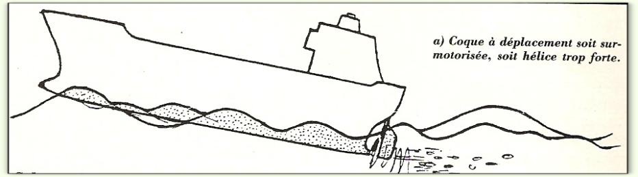 Connaissant le pas de l'hélice, on pense pouvoir calculer la vitesse de notre bateau ... Mais, cette vitesse est moindre : l'hélice n'avance pas par tour de la distance indiquée par le pas théorique obtenu. Il faut introduire la notion de glissement qui dépend de la forme de la coque .