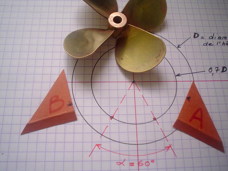 . enlever l'hélice puis unir les points tracés à partir du centre et mesurer l'angle formé : ici, α = 60° |