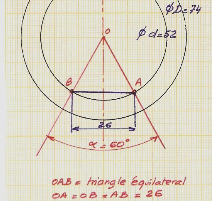 Il est aussi possible d'appliquer une autre formule trouvée chez Léonard SUYKENS. On ajoute la mesure au réglet ou par le "calcul" de la corde formée par l'angle α : ici 26 mm