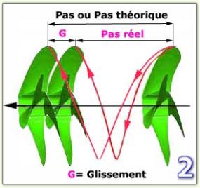 Le pas est la distance théorique qu'une hélice devrait parcourir pendant 1tour si elle tournait dans un solide : mais l'eau n'est pas un solide, il se produit des pertes. Là est la différence entre le pas théorique et la distance réellement parcourue : cette différence est le glissement ou le recul."( Mar LAMOUR dans MRB 318.