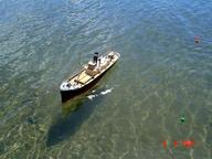 Petites observations : . ma chaloupe présente une légère vague d'étrave et se déplace de façon réaliste alors que je marche à vitesse normale sur la berge, donc elle doit avancer à la vitesse de 3 ou 4 km/h . mon cargo avance à la même vitesse, présente la même vague, mais son allure n'est pas réaliste (il faut dire qu'il n'est pas dans ses lignes d'eau !)