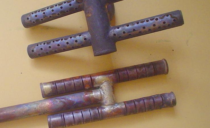 14 - brûleur à rampes (trous) pour chaudière de type SCOTT | Un brûleur qui ressemble à celui décrit au paragraphe 9. Ici, au lieu d'augmenter le nombre de fentes, on pourra jouer sur le diamètre des trous. |