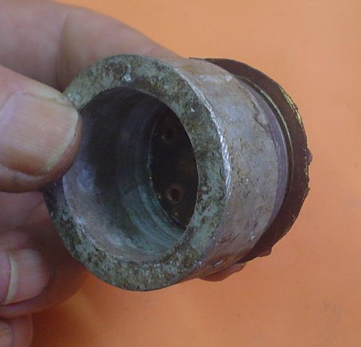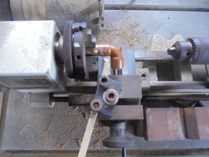 Le diamètre du coude en cuivre est de 13.5 à l'extérieur et pour entrer dans le tube central il faut le réduire sur 5 mm au diamètre 12,9. On y soude un rond (petite soudure à l'étain) pour le maintien dans le mandrin. |