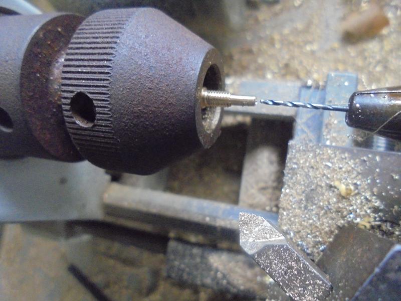 Après la réalisation dans du rond de laiton de diamètre 4, on procède au perçage au diamètre 1 de l'orifice qui recevra le bout d'aiguille. |
