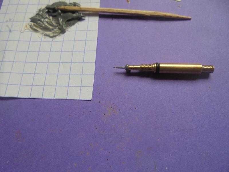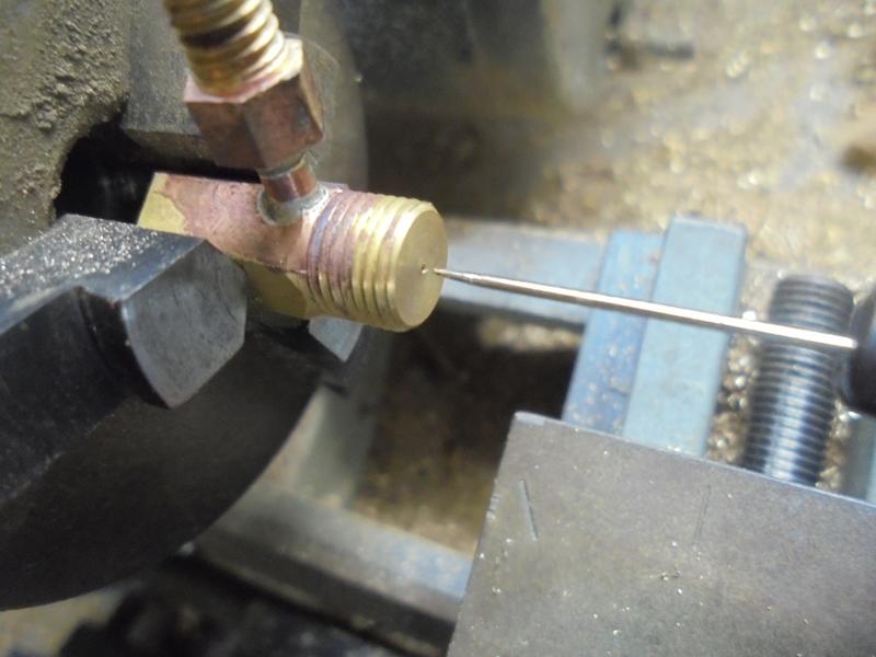 |  Avant de continuer, vérification: la pointe de notre aiguille doit dépasser légèrement du trou du gicleur percé à 0.5, bien centrée. |