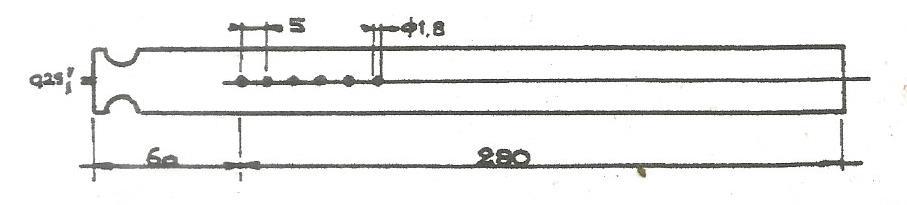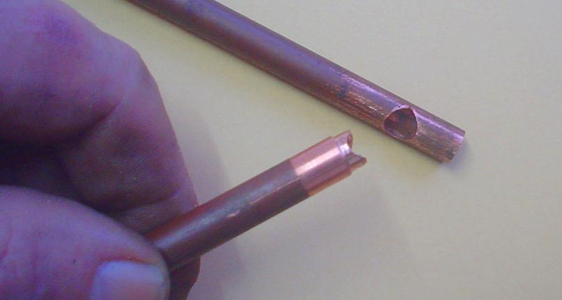 Tube de 8 mais perçage à diamètre 7 en descendant bien jusqu'au centre du tube. Pour l'assemblage d'un tube perpendiculaire, on le reprendra à diamètre 7 sur 4 mm et, à la lime, on le creusera pour permettre au gaz de ne pas rencontrer trop d'obstacles. |