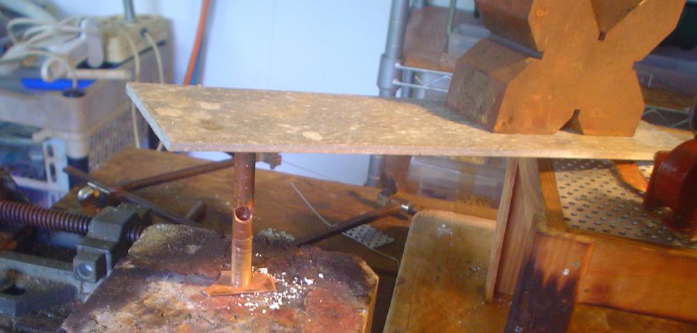 Un montage "olé-olé" pour maintenir le tube pendant la brasure. Le tube repose sur un morceau de tôle de 1 mm d'épaisseur qui, après la brasure, sera découpé à la cisaille puis repris au tour.
