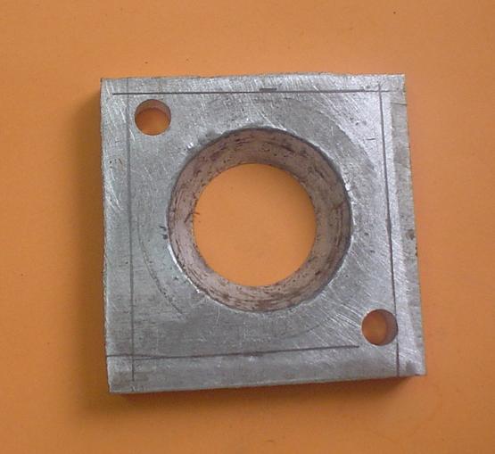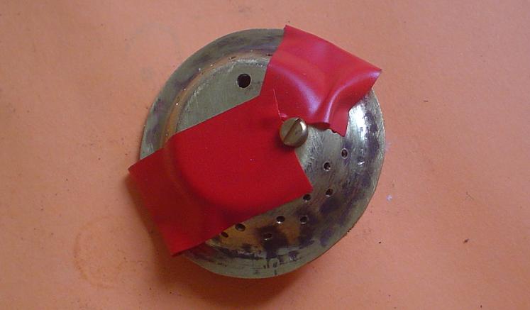 Découper un disque pour le dessous du brûleur. Le percer au diamètre 4. Percer les 4 trous de fixation. Maintenir le disque du fond avec du collant sur le champignon pour percer à travers l'emplacement de la première vis. Visser puis percer les autres trous. Petit repère sur le côté pour les montages et démontages successifs. |