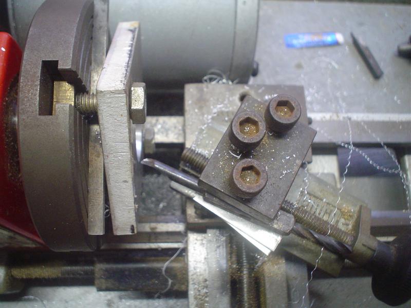 Vérifier la position du porte-outils à la main, on ne doit buter sur rien quand on va avancer ... Ici, reprise et agrandissement du trou de 12 percé au préalable jusqu'à 18 de diamètre |