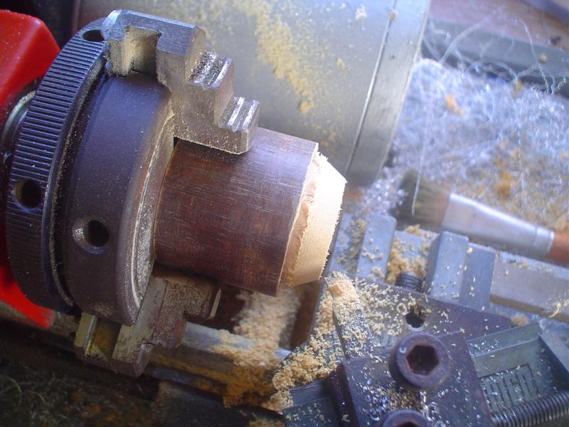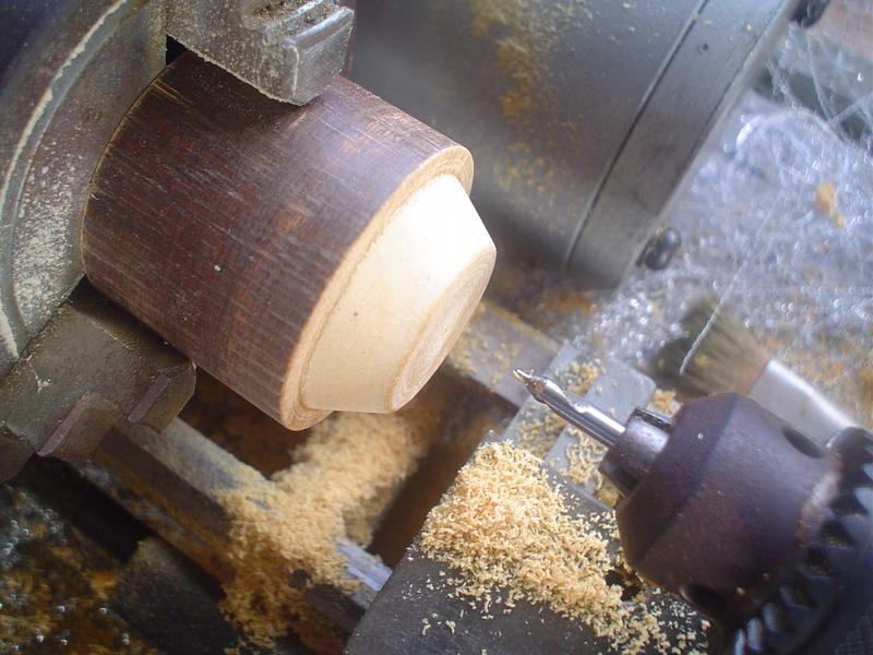 Tout commence par la réalisation d'un nouveau poinçon. N'ayant pas de rond d'alu de 50, un tube de 30 a été emmanché à force (il faut cependant enlever quelques dizièmes au préalable). Donner la même forme au tour puis emmancher et coller un rond de bois dans le tube central.