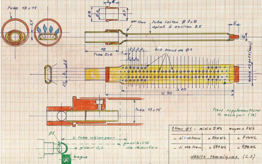 Lors d'un rangement (rare) j'avais retrouvé ce plan d'un brûleur de Robert BISCHOFF. Il est rond mais le perçage de 50 trous de diamètre 1 m'a donné des idées.