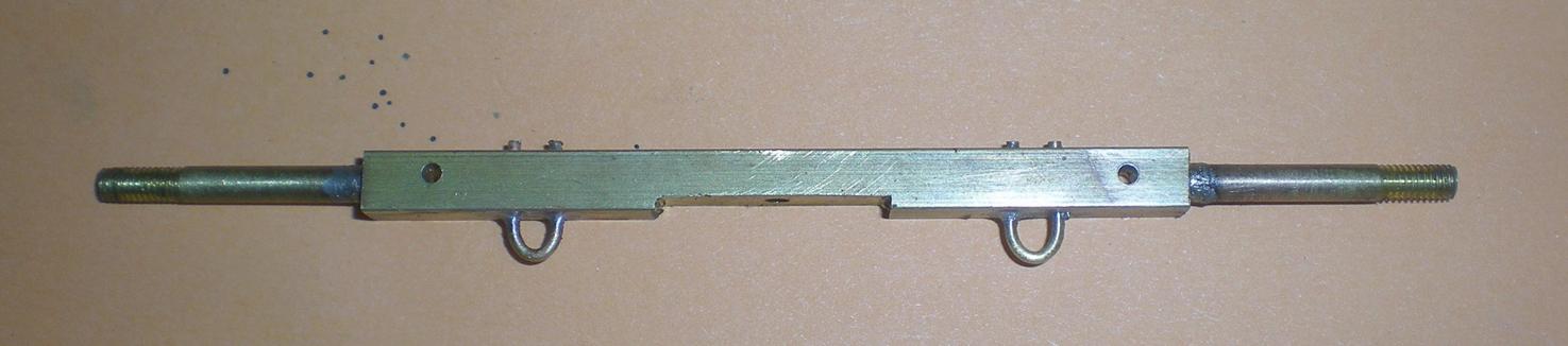 Par la suite, il faudra ajouter de quoi fixer la chaîne de direction : perçage à 1.2 à travers l'essieu (2 trous à 5mm de distance de part et d'autre), passage d'un fil de laiton de 1 mm de diamètre préalablement arrondi sur un rond de 4. |