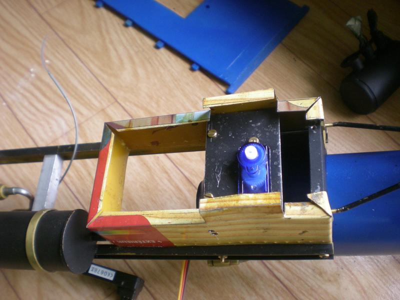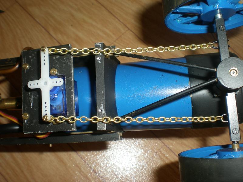 On commencera par fixer les tirants en vérifiant bien que le pivotement se fait sans effort. Les chaînes sont tenues et relier au bras du servo par des vis M1.6. Un "réservoir à eau" réalisé en tôle viendra dissimulé le tout. |