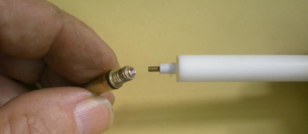 | Amélioration du truc du cône en téflon : on enlève le cône en laiton, on perce à 1.6 puis on taraude à M2. Préparation d'un tenon de 3.4 en téflon que l'on perce à 1.6 et dans lequel on visse un bout de tige filetée de M2.