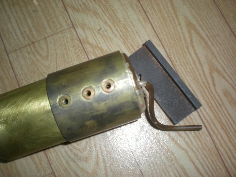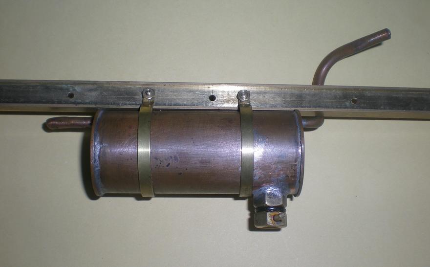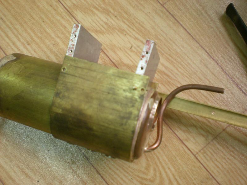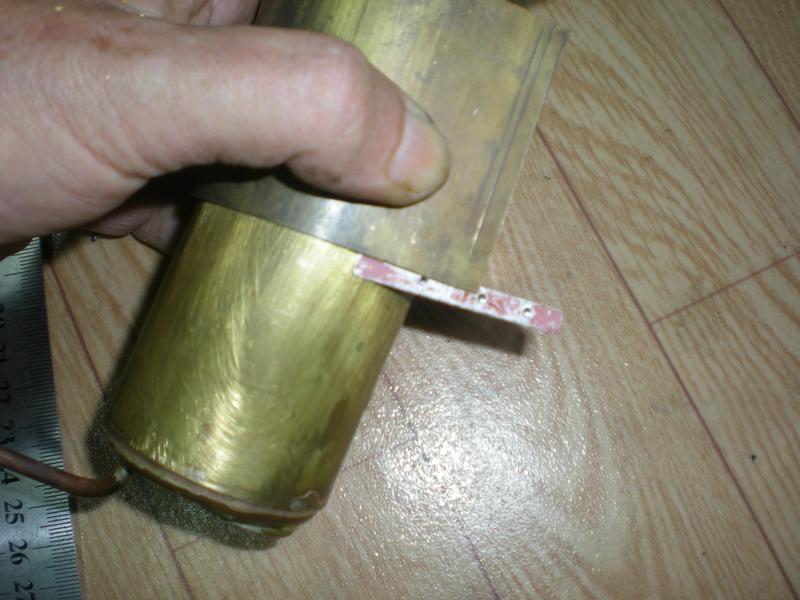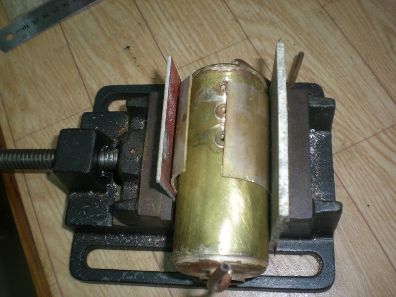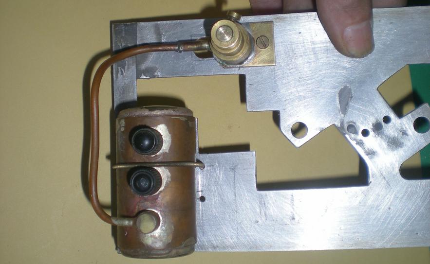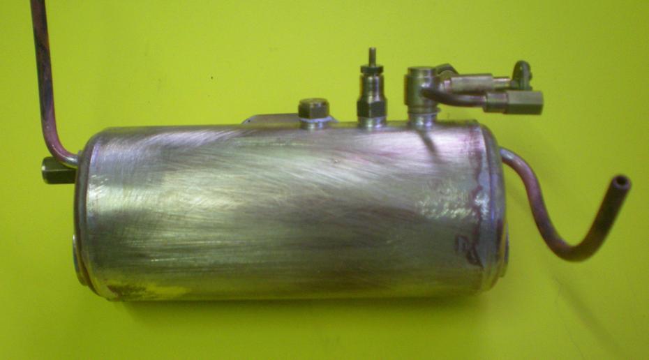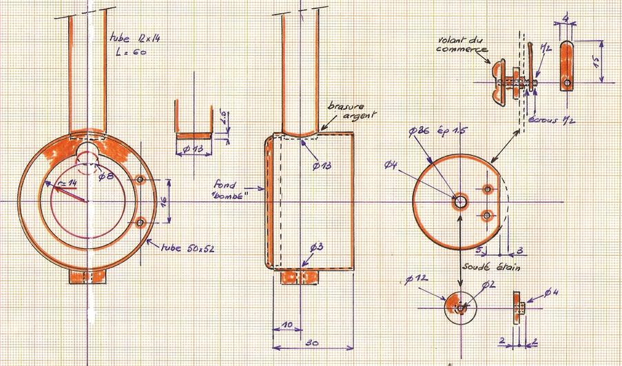 le réservoir de gaz et sa vanne | Une construction devenue classique à partir d'un tube de cuivre de 30 x 32 avec des fonds bombés en laiton de 0.5 d'épaisseur. Pose de deux valves d'auto et d'une sortie vers la vanne. Pour la vanne, utilisation d'un cône en téflon. |
