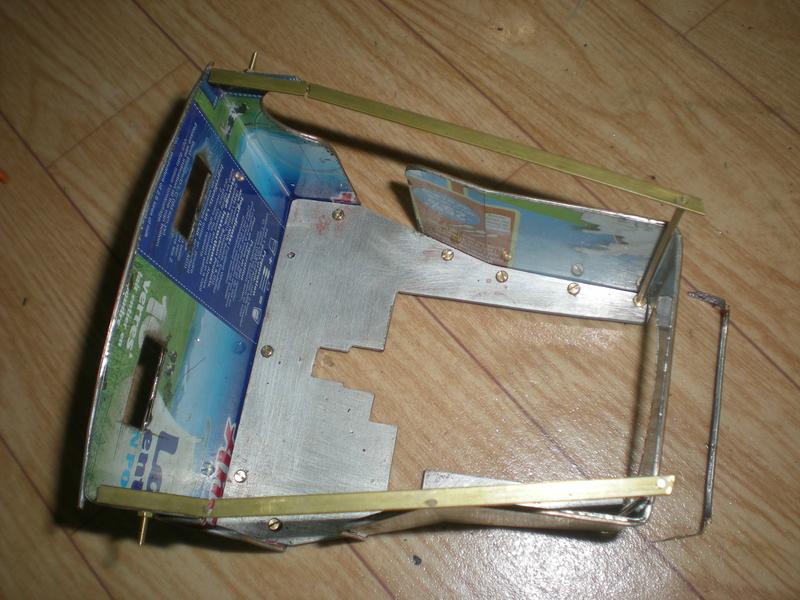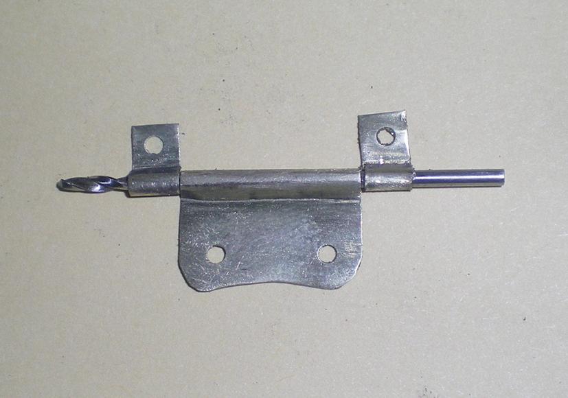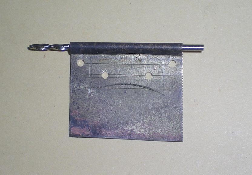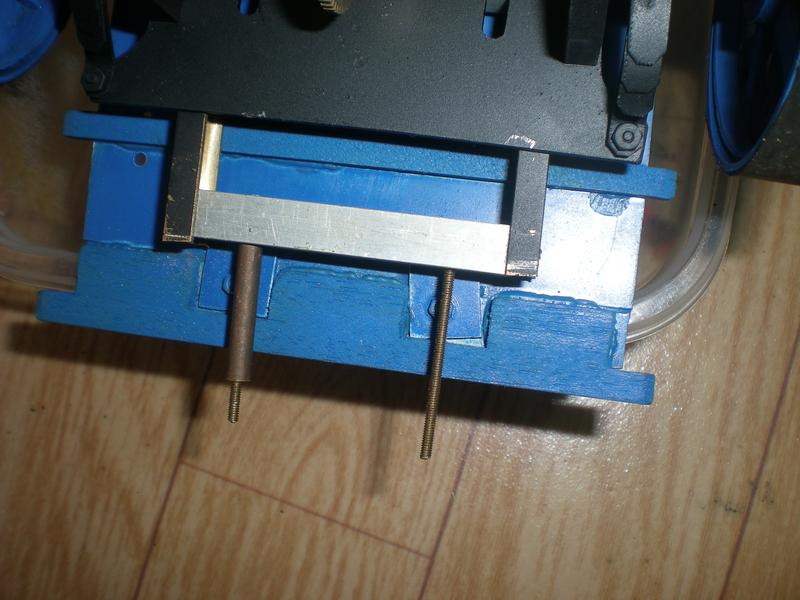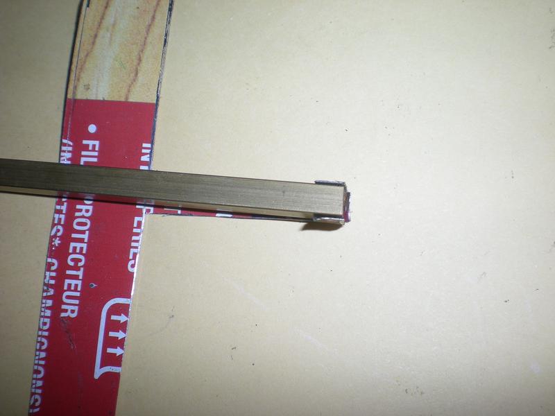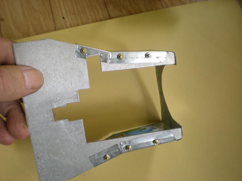 Après soudure à l'étain, pose d'un autre profilé en alu obtenu à partir d' un vieux parasol (voir la loco) : perçage à 2.5, taraudage, puis nouveau perçage en haut à 3 pour placer une vis M3. |