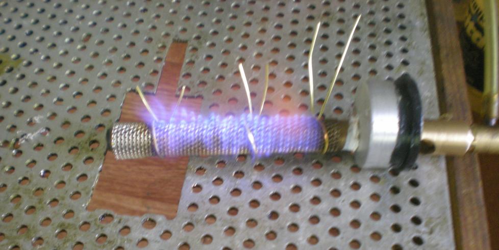 Quand on observe la photo précédente, on voit que la flamme est un peu trop jaune : trop d'air malgré le porte-gicleur réglable.