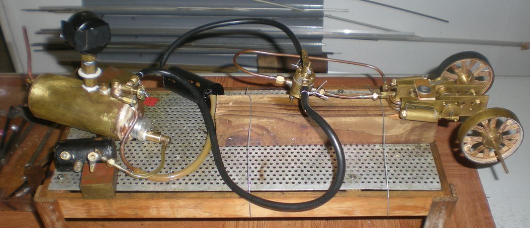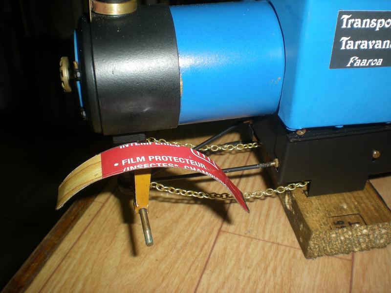 essai final | Opérations successives : . les pleins : eau, gaz, huile (je suis revenu à l'huile d'olive) . allumage du brûleur que l'on cale comme prévu lors des essais (3/4 d'ouverture pour moi) et fermeture de la porte . mise sous tension de la radio et dernière vérification du fonctionnement . surveiller le manomètre (on atteint les 2 bars en un peu plus de 4 minutes puis ça s'accélère et on ouvre la vanne vapeur (1/4 de tour pour moi) une fois les 4 bars atteints voire légèrement dépassés. . poser le toit, le chargement . le camion ne démarre pas immédiatement, il faut actionner plusieurs fois le levier de l'inverseur (condensats)