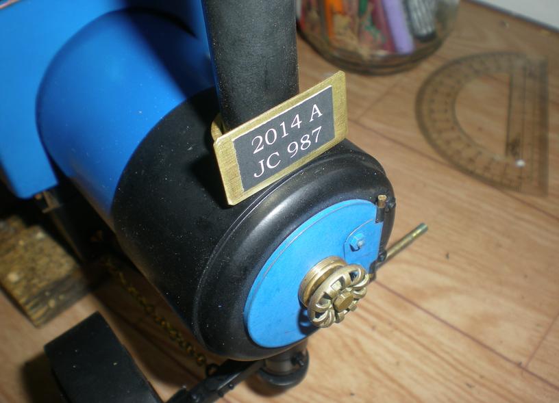 Petite bague de laiton qui va s'enfiler sur la cheminée et sur laquelle on soude (l'étain suffit) une plaque de laiton de 0.5 sur laquelle il restera à poser un auto-collant obtenu à l'aide de l'imprimante Pas encore décollé malgré le nombre de chauffes ... |