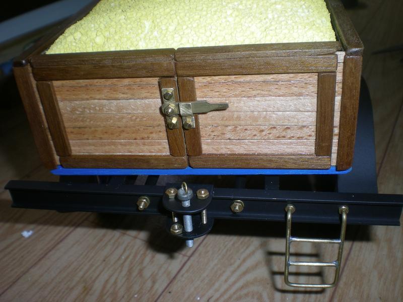 | Une fois tous les ajustage terminés, on démonte la platine, on la nettoie soigneusement et on colle les tasseaux de manière à ce qu'ils dépassent de 5 mm : les côtés de la benne viendront plus tard s'y poser. Parfois on doublera les tasseaux (perçage pour une fixation en fonction de la platine) mais en n'en laissant déborder qu'un seul.
