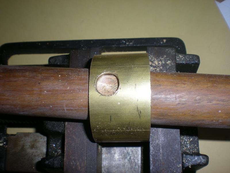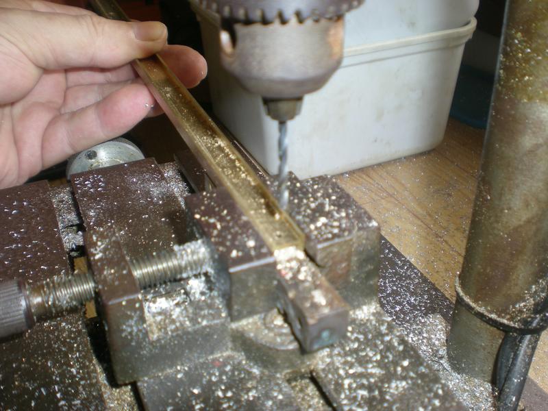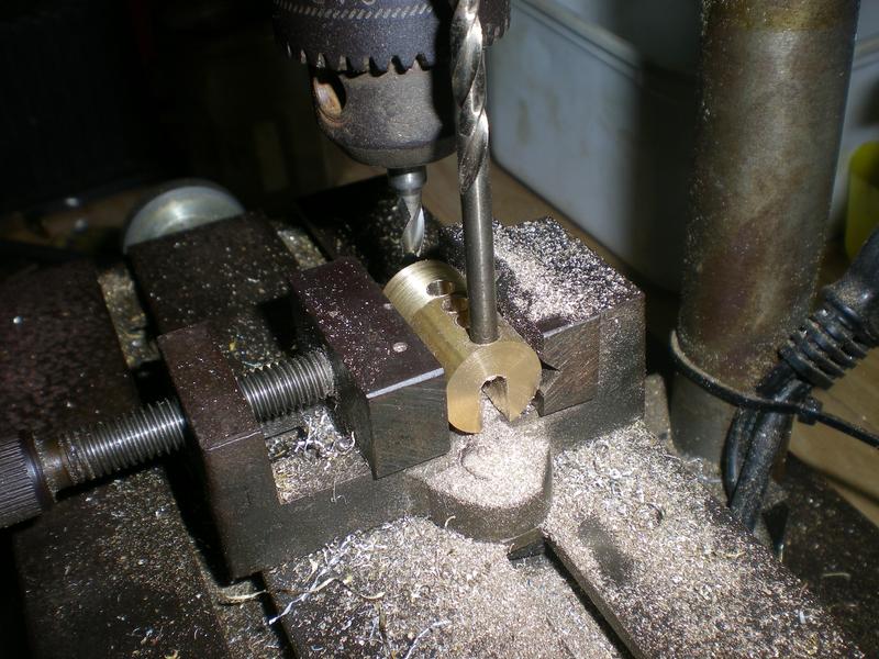 | Perçage d'un trou de diamètre 13 qui permettra l'emboîtement de la cheminée que l'on reprendra à diamètre 13 : si l'ajustement se fait serré, on n'aura pas de difficultés pour le positionnement lors de la brasure. Afin de ne pas écraser le tube, on perce sur un rond de bois calé dans l'étau. |