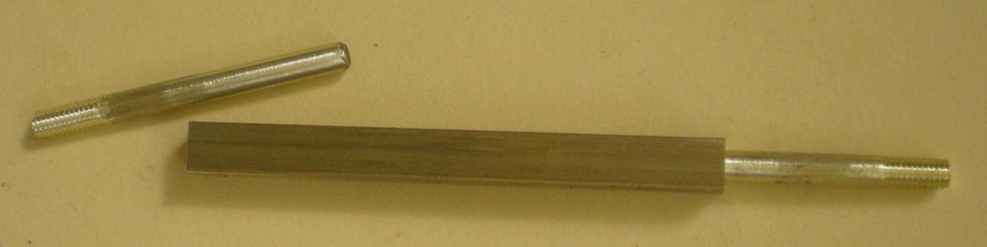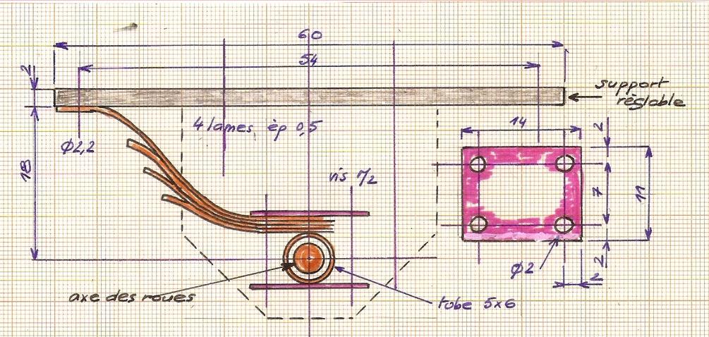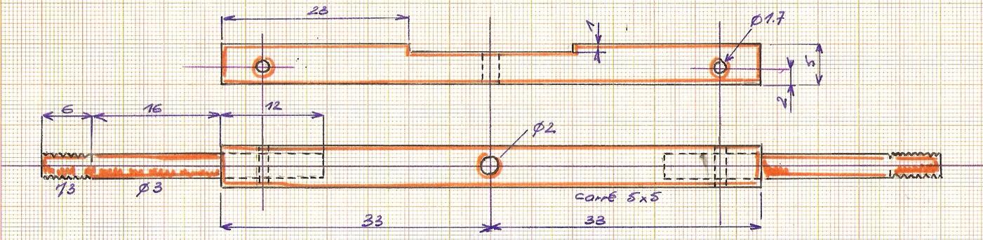 Il est fabriqué avec un carré de 5. Au centre on trouvera une partie réduite à 4 d'épaisseur qui permettre la passage dans le pivot. Les axes des roues sont des ronds de diamètre 3 filetés en bout.